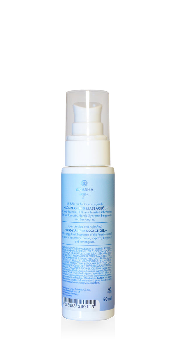 SIMMONDSIA CHINENSIS SEED OIL*, PRUNUS ARMENIACA KERNEL OIL*, COCOS NUCIFERA OIL*, PUNICA GRANATUM SEED OIL*, SESAMUM INDICUM SEED OIL*, ROSMARINUS OFFICINALIS LEAF OIL*, CITRUS AURANTIUM AMARA PEEL OIL*, PINUS MUGO TWIG OIL*, CUPRESSUS SEMPERVIRENS BRANCH/LEAF OIL*, CITRUS AURANTIUM BERGAMIA PEEL OIL*, CYMBOPOGON FLEXUOSUS OIL*, BOSWELLIA CARTERII OIL*, MAGNOLIA CHAMPACA FLOWER OIL (From natural essential oils: Limonene, Citral, Linalool, Geraniol, Eugenol, Citronellol, Isoeugenol) *kbA / Certified organic agriculture