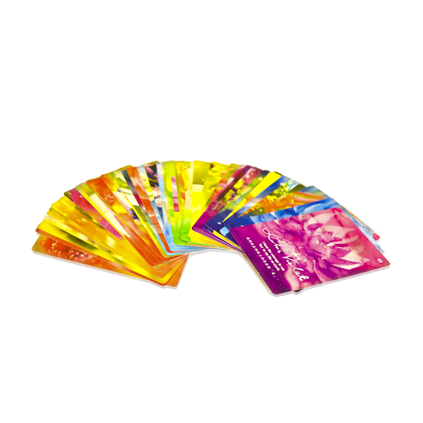 Die Flower Cards sind den 7 Chakren zugeordnet. Für jedes Chakra gibt es 6 Blüten- oder Pflanzen-Karten und 1 Karte der reinen Farbe des Chakras. Es gibt unendlich viele Arten, wie Du sie für dich nutzen kannst. Einige findest du im beiliegenden Flower Cards Buch, einige mehr kannst du in unseren Workshops kennenlernen. Und darüber hinaus sind deiner Kreativität und spielerischen Ideen keine Grenzen gesetzt.