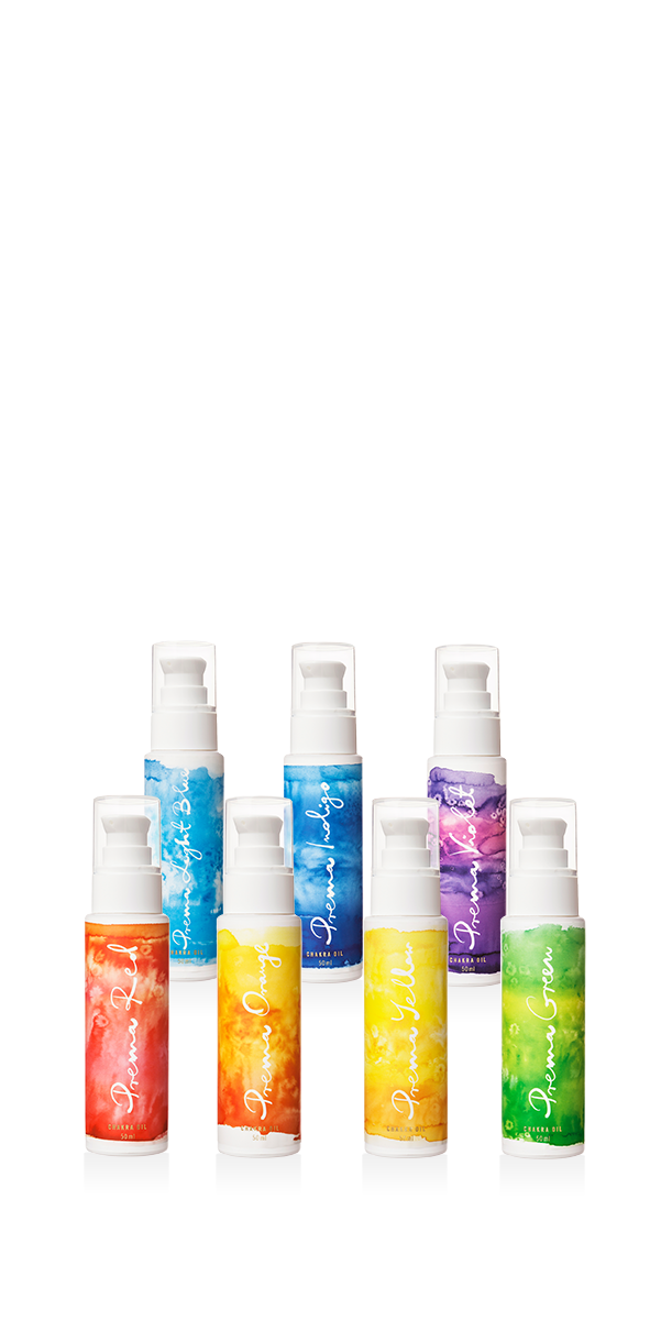 Das Prema 7 Set kombiniert die sieben Prema Öle, die sich auf die sieben Chakren beziehent: Prema RedPrema OrangePrema YellowPrema GreenPrema Light BluePrema IndigoPrema Violet
